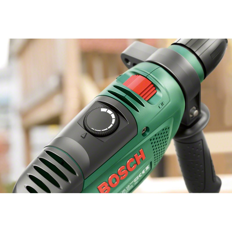 Variateur électronique Bosch : présélection et réglage de vitesse par molette et gâchette – permet un dosage fin de la vitesse en fonction du matériau, par exemple pour l'amorçage de trous dans des surfaces lisses et pour le vissage de vis